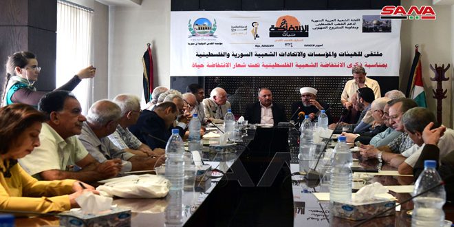 أكد المشاركون في ملتقى الهيئات والمؤسسات والاتحادات الشعبية السورية والفلسطينية الذي انعقد اليوم بمناسبة ذكرى الانتفاضة الشعبية الفلسطينية بعنوان “الانتفاضة حياة” على أهمية توحيد الجهود والمواقف مع الشعب الفلسطيني لمواجهة كل المخططات الصهيونية وتحرير الأراضي المحتلة.