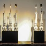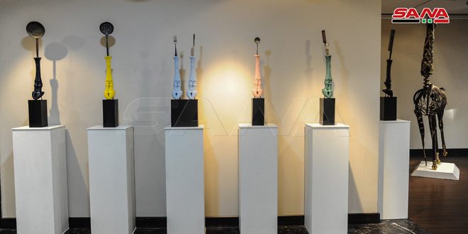 المعرض الذي جاء بعنوان “وأما بعد .. الموت يسكن قريبا مني” وتستضيفه صالة تجليات تضمن 23 منحوتة بخامات من الحديد والنحاس مع الريزين بتشكيلات لا تخلو من الحركة في دلالة على رفض الموت مع عدة أعمال جاءت على شكل حوافر حيوان مغروس فيها أدوات مطبخ من سكين وشوكة وملعقة عكست موقف الفنانة من تعامل البشر مع الحيوان كمصدر للغذاء وتبرير قتله إضافة لعملين من المعدن لحافرين عملاقين.