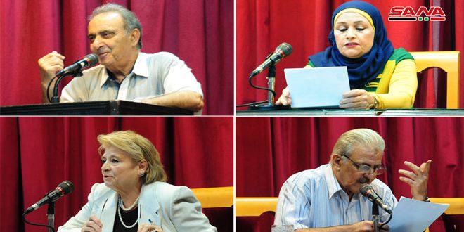 وألقى القاص أحمد جميل حسن قصصاً تعبر عن أهمية النضال ورفض الاحتلال والإرهاب والعمل على خلق ثقافة واعية والدفاع عن الوطن بكل السبل وفق منظومته الأدبية التي شملت القص والرواية بأسلوب شائق.