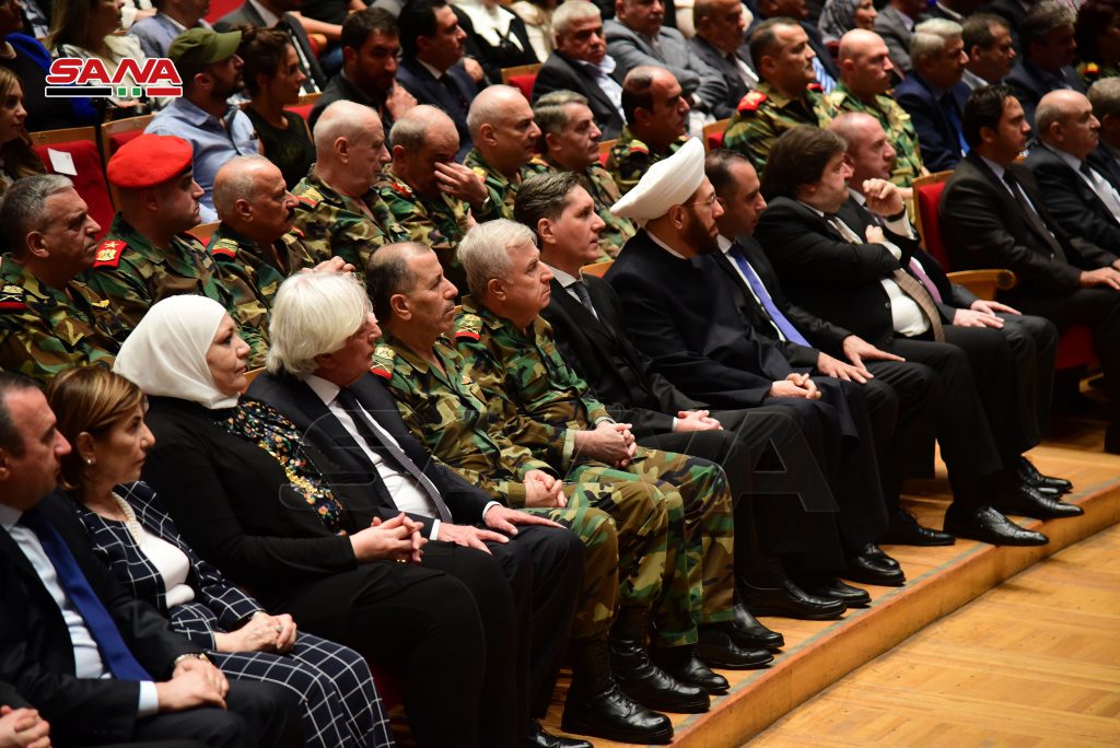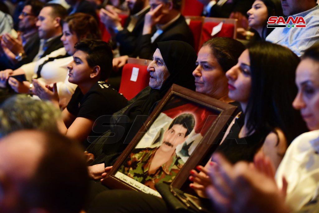 حضر حفل التكريم العماد علي عبد الله أيوب نائب القائد العام للجيش والقوات المسلحة وزير الدفاع ووزراء الشؤون الاجتماعية والعمل ريمه قادري والإدارة المحلية والبيئة حسين مخلوف والثقافة محمد الأحمد والإعلام عماد سارة والسياحة محمد رامي رضوان مرتيني والدكتورة بثينة شعبان المستشارة السياسية والإعلامية في رئاسة الجمهورية ومحسن بلال عضو القيادة المركزية لحزب البعث العربي الاشتراكي وشهيرة فلوح مدير عام مديرية مدارس أبناء وبنات الشهداء ومدير الإدارة السياسية اللواء حسن حسن وعدد من ضباط الجيش وأسر ذوي الشهداء وشخصيات فنية وثقافية وإعلامية.