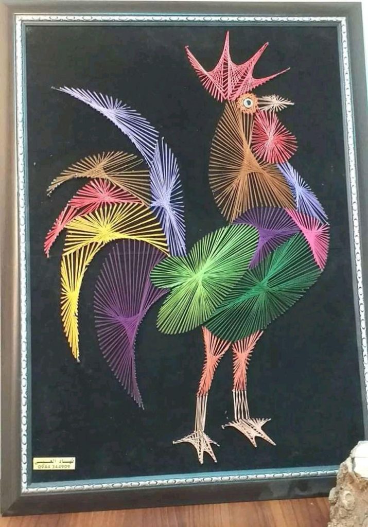 اللوحات جاءت مشغولة بأسلوب الخيوط الوترية التي زرعت على مسامير فوق سطوح لوحات خشبية لتشكل صورة عمل فني بإتقان وبصورة منسجمة مع الألوان التي حاكت المضمون.