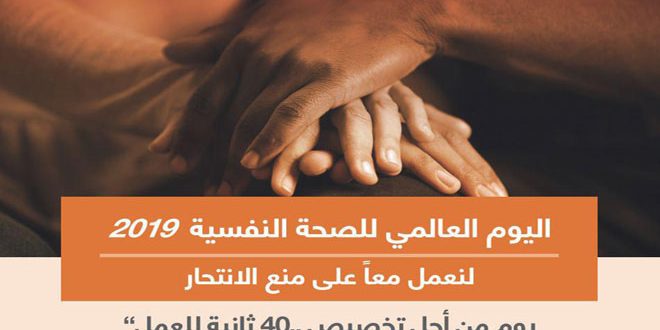 يعود اليوم العالمي للصحة النفسية في العاشر من تشرين الأول ليذكر بضرورة تعزيز جهود الدول والمجتمعات لتحسين الصحة النفسية والتركيز على الوقاية من اضطراباتها مع التركيز على الانتحار الذي يقتل شخصا كل 40 ثانية عالميا وهو ثاني أسباب الوفاة بين الشباب بعد حوادث المرور.