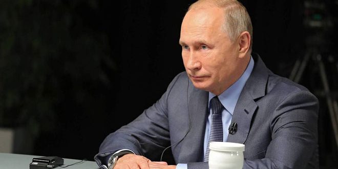وأشار بوتين في مقابلة مع قناة روسيا اليوم إلى أنه لا يمكن السماح للتنظيمات الإرهابية بالاستيلاء على المزيد من الأراضي في سورية ولا بتدفق الإرهابيين منها إلى بلدان الاتحاد السوفييتي السابق مؤكدا مواصلة بلاده تقديم الدعم لسورية في حربها على الإرهاب حتى القضاء عليه نهائيا.
