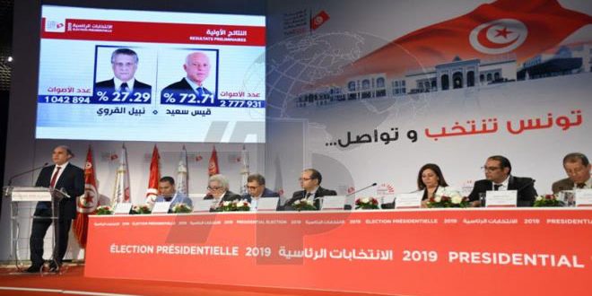 ووفق النتائج الأولية الرسمية التي نشرتها الهيئة العليا للانتخابات على موقعها الإلكتروني ونقلتها وكالة تونس إفريقيا للأنباء: حصل سعيد على نسبة71ر72 بالمئة من أصوات الناخبين في الجولة الثانية من الانتخابات مقابل29ر27 بالمئة لمنافسه نبيل القروي.