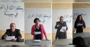 قصائد وطنية تحتفي ببطولات الجيش العربي السوري وتمجد تضحيات شهدائه تضمنها المهرجان الشعري الذي أقامه ملتقى القرداحة الثقافي بمناسبة أعياد تشرين اليوم في صالة سامي الدروبي بالمركز الثقافي في حمص.