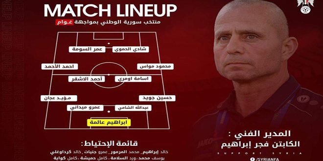 أعلن المدير الفني لمنتخب سورية لكرة القدم للرجال فجر إبراهيم تشكيلة منتخبنا في مباراته مع منتخب غوام على أستاد مكتوم في الإمارات العربية المتحدة ضمن التصفيات المزدوجة لنهائيات آسيا وكأس العالم.