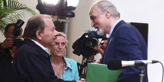 وفي كلمة له تلت تقديم أوراق اعتماد عدد من السفراء من بينهم السفير الجعفري أكد الرئيس أورتيغا أن نضال سورية أثمر عن نصر بات اليوم أقرب من أي وقت مضى منددا بسياسة الولايات المتحدة الأمريكية التدخلية والعدوانية ضد بلاده وغيرها من دول أمريكا اللاتينية.