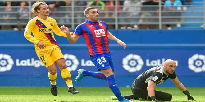 تغلب فريق برشلونة على إيبار بثلاثة أهداف مقابل لاشيء لينتزع صدارة الدوري الإسباني لكرة القدم.