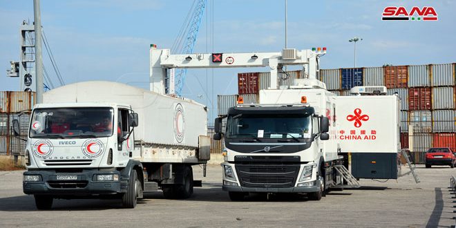 استلمت الحكومة السورية اليوم الدفعة الرابعة من المساعدات الإنسانية والمنحة المقدمة من جمهورية الصين الشعبية والتي تضمنت 1152 طنا من الأرز وثلاثة أجهزة كشف (اسكنرات) لزوم عمل مديرية الجمارك.