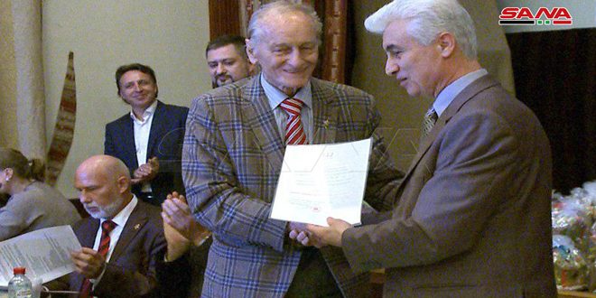 وأشار زين الدين إلى أن قاعة التكريم كانت مزدانة بشعارات ولافتات تؤكد التضامن مع سورية في حربها ضد الإرهاب والغزاة ما يؤكد موقف الكتاب والفنانين والمبدعين الروس الداعم لسورية وشعبها في مواجهة هذا الإرهاب وأدواته.