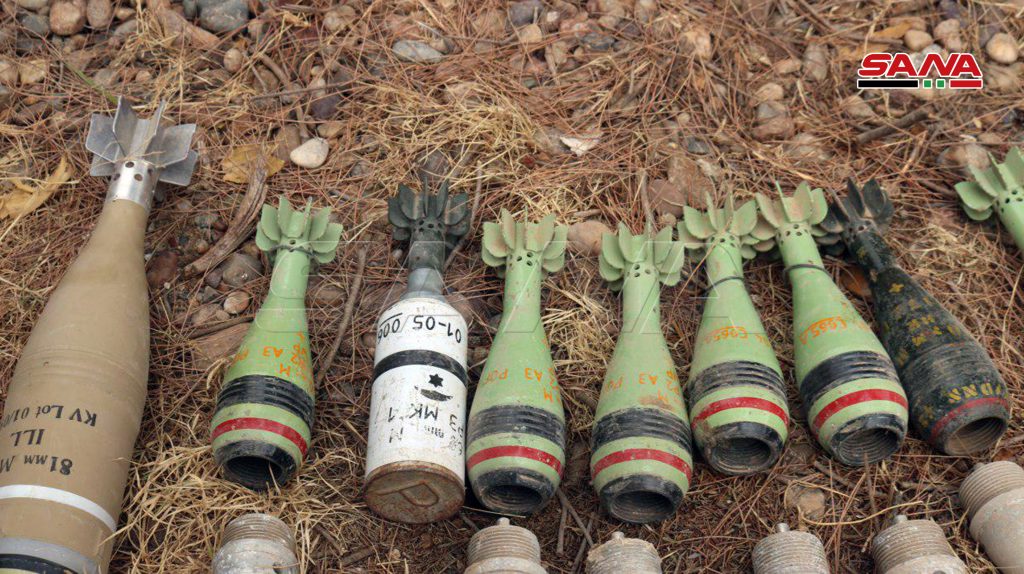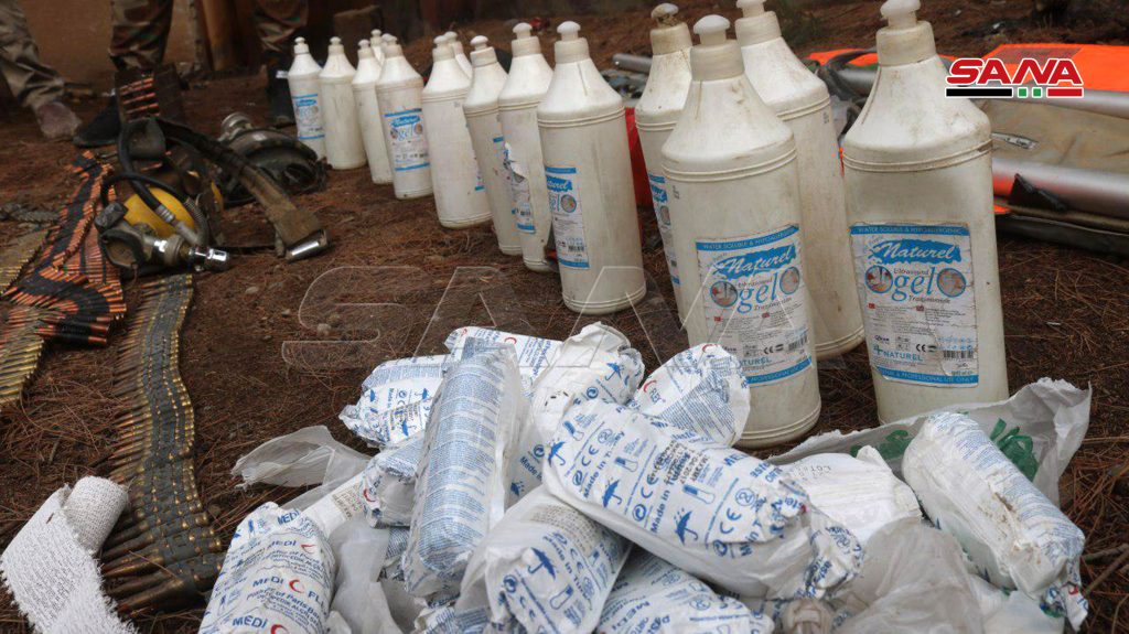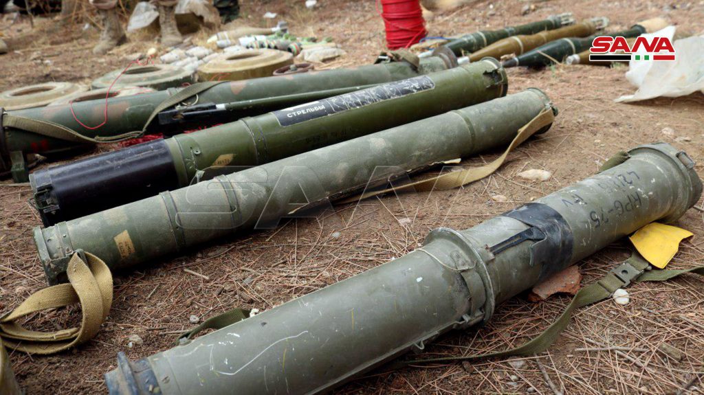 وبين القائد الميداني أن الأسلحة والذخائر التي تم العثور عليها هي “ألغام /م.د/ وصواريخ موجهة محمولة على الكتف وقذائف هاون وقواذف /ار بي جي/ وأحزمة ناسفة وأقنعة واقية وذخائر متنوعة وأدوية ومواد طبية”.