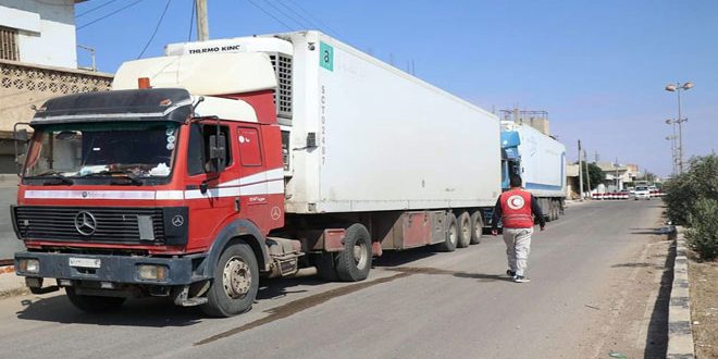 أوصل فرع الهلال الأحمر العربي السوري في درعا قافلة مساعدات غذائية مؤلفة من 12 شاحنة لتوزيعها على الأهالي في مدينة إنخل بريف درعا الشمالي.
