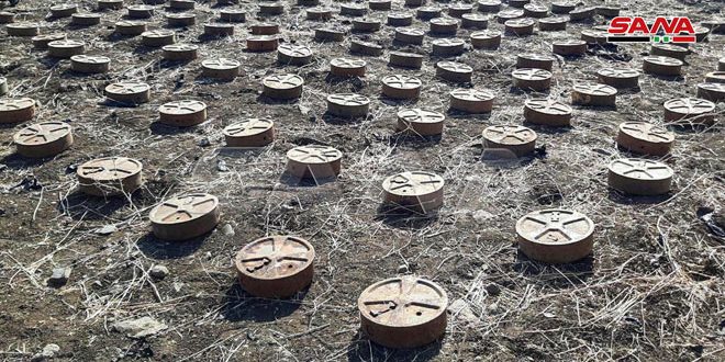 وذكر مصدر في الجهات المختصة في تصريح لمراسل سانا أن “الجهات الأمنية المختصة بالتعاون مع وحدات الجيش عثرت على مخبأ تحت الأرض يحوي أعداداً كبيرة من الألغام مضادة للدروع إسرائيلية وأمريكية الصنع من مخلفات إرهابيي تنظيم (داعش) بمحاذاة الشريط الشائك مقابل تل الساقية المحتل وجنوب قرية صيدا الحانوت بريف القنيطرة الحنوبي”.