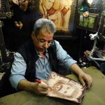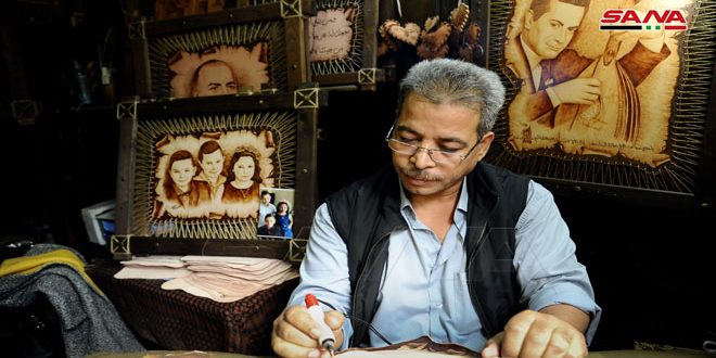 أتقن أحمد بغدادي فناً فريداً من نوعه وهو الرسم بالحرق على الجلد الطبيعي ليتخذ من محله الصغير في باب شرقي بدمشق القديمة معرضاً مفتوحاً لإبداعاته في رسم لوحات تزين جدران البيوت والقصور.