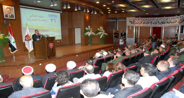 من جانبه الدكتور فرح المطلق معاون وزير التربية أوضح أن تخصيص هذا اليوم العالمي بمكافحة المخدرات يعد مؤشرا على خطورة هذه الظاهرة ودليلا قاطعا على جدية المجتمعات الإنسانية بالبحث التعاوني الجاد عن سبل التخلص منها وما الجهود التي تبذلها الجهات المعنية في سورية إلا تأكيدا على الحرص على بناء مجتمع سليم معافى قادر على السير في ركب الحضارة الإنسانية كي تعود أمتنا إلى مكانها اللائق تحت الشمس بسواعد أبنائها المتمتعين بالسواء الوجداني والجسدي والنفسي وبالتالي المواطن الإنسان. وبين الدكتور المطلق أنه أصبح لزاما على الإنسانية أن تواجه بشتى الوسائل والطرائق هذه الآفة الخطيرة خاصة أنه عندما تؤكد المصادر الموثوقة أن ظاهرة الإدمان تفشت بين الشباب والطلبة والفتيان كما أنها أصبحت تجارة لكل من المنتجين والمروجين لأن انفجار هذه القنبلة الموقوتة سيؤول بالتالي إلى تدمير المجتمعات وقيمتها وأخلاقها مما يقتضي تضافر الجهود لمكافحتها من منطلق الحرص الإنساني والوطني والاجتماعي والاقتصادي على سلامة المجتمعات والأبناء. كما أشار إلى الدور الكبير الذي تضطلع به وزارة التربية في مجال بناء الإنسان وبالتعاون مع الوزارات والمؤسسات الأخرى في مجال مكافحة ظاهرة المخدرات ووضعت خطة عمل في مجال نشر ثقافة رفض المخدرات في العام الماضي وقامت بتشكيل فريق عمل بيئي وطني في الوزارة انبثق عنه لجنة خاصة حول التوعية بمخاطر المخدرات وانتشارها بين الشباب والقيام بزيارات ميدانية إلى بعض مدارس دمشق وريفها وتوعية الطلاب والحوار معهم حول انتشار المخدرات وطرق الوقاية منها كما تم التركيز على الأسرة كمدخل أساسي لحماية الشباب من المخدرات وعقد ندوات حوارية مع الموجهين الاختصاصيين والتربويين بالتعاون مع وزارتي الداخلية والصحة وإدارة مكافحة المخدرات في وزارة الداخلية. حضر الاحتفال معاونو وزير الداخلية ومديرو الإدارات والمكاتب المركزية وقادة شرطة محافظة دمشق وريف دمشق والقنيطرة وعدد من ضباط قوى الأمن الداخلي وعدد من القضاة ورجال الدين وممثلين عن المنظمات الشعبية والنقابات المهنية.