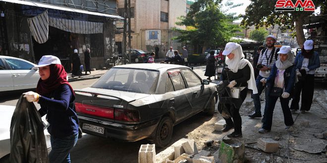 بمشاركة مئات المتطوعين والمتطوعات أقامت محافظة دمشق اليوم حملة نظافة وتوعية بأهمية الحفاظ على البيئة ضمن فعاليات المهرجان البيئي الثالث المقام تحت عنوان (بتعاوننا نرتقي ببيئتنا).