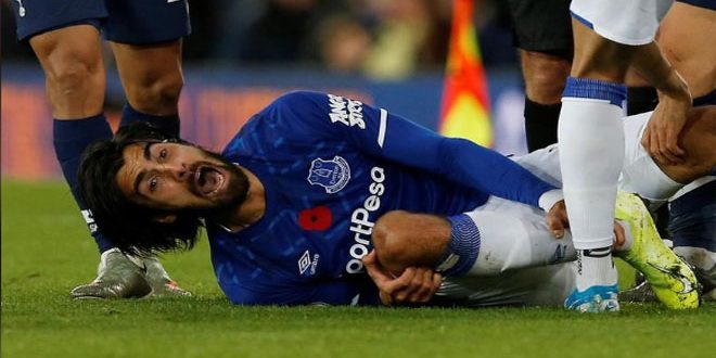 وأصيب اللاعب الدولي البرتغالي بكسر وخلع في الكاحل الأيمن وغادر ملعب جوديسون بارك في لقاء فريقه مع توتنهام هوتسبير الأحد الماضي.