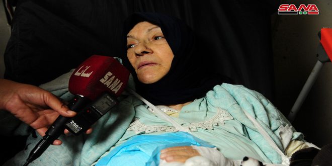 كاميرا سانا زارت الجرحى الذين أسعفوا إلى مشفى المواساة الجامعي حيث بينت ربيعة هاشم صفد الحلبي الثمانينية أنها شعرت فجأة وكأن البناء يسقط فوق رأسها وبدأت بالصراخ خوفاً على أبنائها لكنها فقدت الوعي واستفاقت في المشفى”.