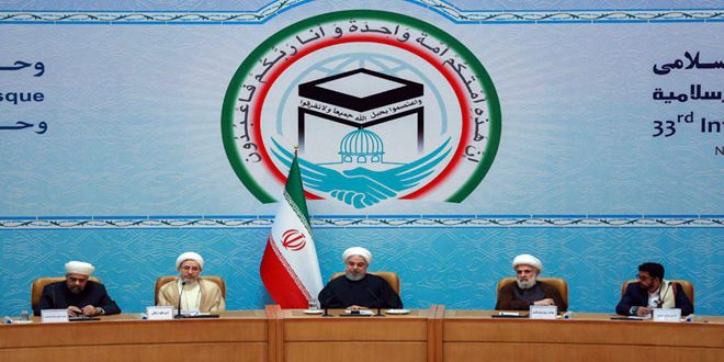 وأكد الرئيس الإيراني حسن روحاني في كلمة خلال افتتاح أعمال المؤتمر أن كل الحروب وإراقة الدماء والفتن على مدى العقود الثلاثة الماضية في المنطقة سببها أميركا والكيان الصهيوني مبينا في الوقت ذاته أن هدف الولايات المتحدة من نشر قوات احتلال لها في سورية لم يكن يوما محاربة الإرهاب وهي تقوم اليوم بسرقة آبار النفط في هذا البلد.