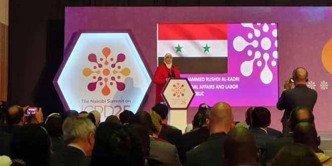 وأضحت الوزيرة قادري خلال كلمة الوفد السوري اليوم في مؤتمر نيروبي الدولي للسكان والتنمية أن سورية حققت خلال العقد الأول من الألفية الثالثة إنجازات تنموية مهمة تشهد عليها تقارير التنمية البشرية وتقارير التنمية الألفية التي أعدتها المنظمات الدولية خلال تلك السنوات لكن سورية منذ 2011 تواجه ظروفاً استثنائية بسبب الحرب الإرهابية عليها التي أحدثت دماراً في البنى التحية والبيئية وأثرت سليباً على الخطة التنموية التي كانت تعمل عليها بمنحى تصاعدي ملحوظ.