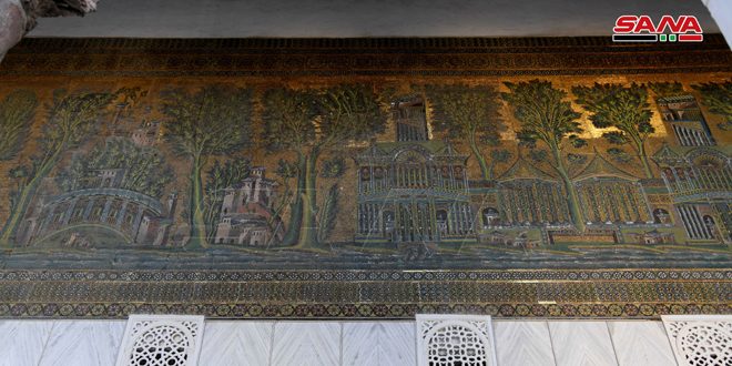 قطع الفسيفساء التي تتصدر مدخل الجامع الأموي تتلاصق ببعضها لتجسد نهر بردى وغوطة دمشق عبر أكبر لوحة فسيفسائية يحتضنها الجامع ارتصفت فيها القطع الحجرية بانتظام واتقان لتروي بلغة الفن العتيق لكل من قصد باب الجامع حكاية مدينة دمشق وتاريخها العظيم مستفيدة من العمارة السورية القديمة.