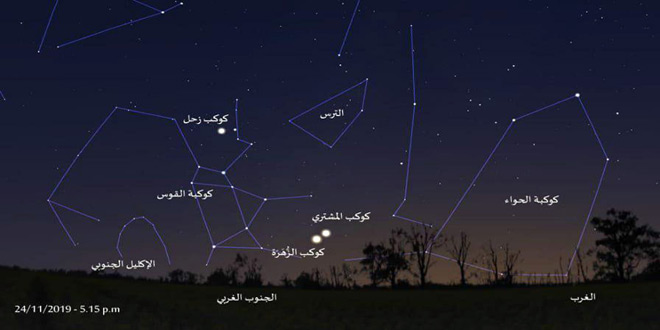 ويدخل المشتري والزهرة في حالة اقتران مع وصولهما إلى الاقتراب الظاهري الأكبر بين الكوكبين يوم الأحد الرابع والعشرين من تشرين الثاني الجاري حيث تكون المسافة الظاهرية بحدود درجة ونصف الدرجة قوسية بحسب نائب رئيس الجمعية الفلكية السورية المهندس عبد العزيز سنوبر.