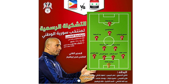 أعلن المدير الفني لمنتخب سورية لكرة القدم للرجال فجر إبراهيم تشكيلة منتخبنا في مباراته مع منتخب الفلبين التي تقام اليوم ضمن مرحلة الإياب في التصفيات المزدوجة لنهائيات آسيا وكأس العالم على استاد مكتوم بن راشد بدبي في الإمارات العربية المتحدة.