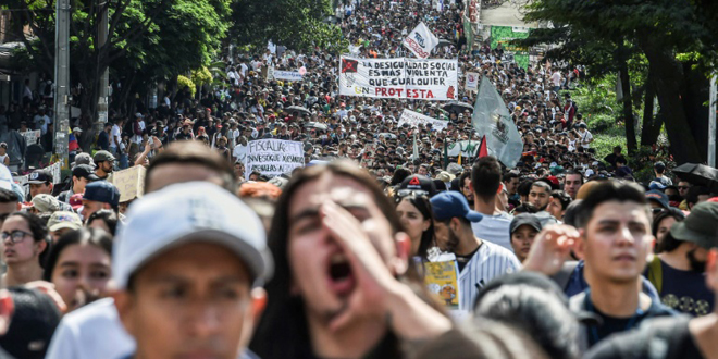 وتظاهر مئات آلاف الأشخاص في أنحاء متفرقة من كولومبيا الليلة الماضية ضد الرئيس دوكي حيث انضمت حشود ضخمة من الطلبة ومنظمات السكان الأصليين ومنظمات بيئية ومعارضة إلى إضراب ومظاهرات نقابات العمال للتنديد بسياسات الحكومة اليمينية.
