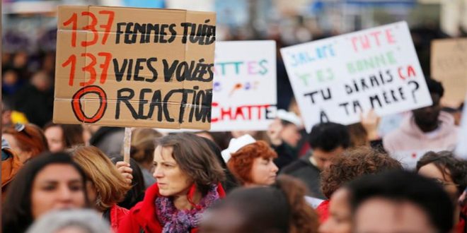 وذكرت رويترز أن المحتجين في باريس ومعظمهم من النساء رددوا هتافات مناوئة للعنف الأسري ورفعن لافتات باللون القرمزى سجلت أسماء الضحايا وكتب عليها شعارات منها “كفى قتلا”.