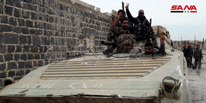 وذكر مراسل سانا أن وحدات من الجيش خاضت خلال الساعات القليلة الماضية اشتباكات عنيفة مع إرهابيي تنظيم “جبهة النصرة” والمجموعات المرتبطة به في قريتي ضهرة الزرزور والصير ومزارع المشيرفة بريف إدلب الجنوبي الشرقي.