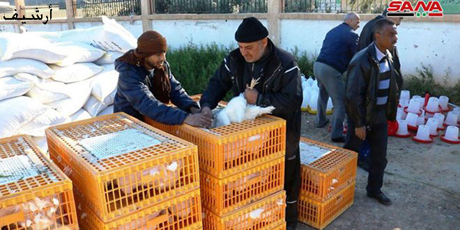 بهدف تحسين دخل الأسر الريفية واستقرارها وزعت وزارة الزراعة والإصلاح الزراعي 67500 فرخة دجاج بياضة على 4500 أسرة في محافظتي ريف دمشق والقنيطرة مع العلف الخاص بها وذلك ضمن المنحة المقدمة من الحكومة لمشروع التربية المنزلية للدجاج البياض الذي يشمل كل المحافظات.