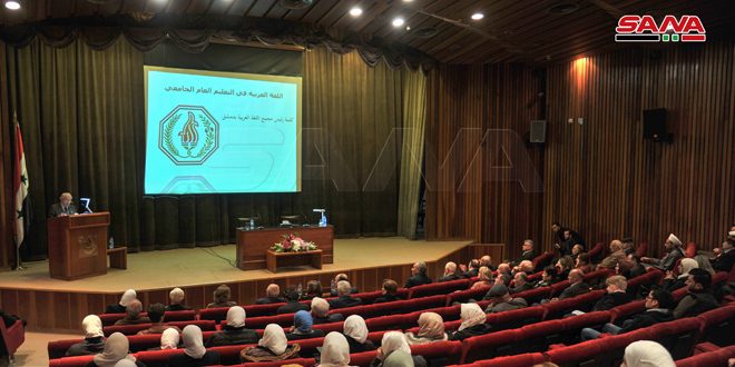 وزير التعليم العالي الدكتور بسام ابراهيم أكد في كلمة له خلال الافتتاح أهمية استخدام اللغة العربية في التعليم الجامعي بكل الفروع والكليات والاختصاصات لأنها كانت لغة العلوم العالمية منذ الأزل وضرورة المحافظة عليها وتطويرها لتساير تغيرات الحياة لكونها بوتقة جامعة لكل ما ننتجه ونبدعه من معارف، مؤكداً قدرة العربية على استقبال أي مصطلح علمي جديد رغم التحديات التي تواجهها كالعولمة وهيمنة اللغة الواحدة إضافة إلى مشكلات الترجمة.