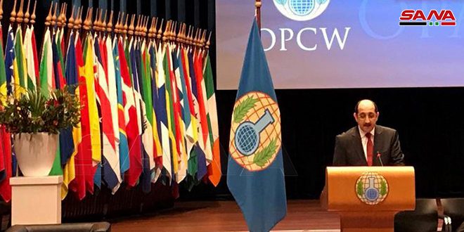 وجدد صباغ دعوة سورية إلى مواجهة اتساع رقعة التهديدات الإرهابية الكيميائية عبر تعزيز الجهود الدولية الرامية لمواجهة هذا التهديد الحقيقي على أمن واستقرار الدول الأطراف والتركيز على التطبيق الفعال لجميع أحكام الاتفاقية بدون انتقائية أو تسييس واتخاذ موقف حاسم تجاه الدول التي تغطي جرائم الإرهابيين آخذين بالاعتبار بدء عودة هؤلاء الإرهابيين الأجانب من سورية إلى بلدانهم الأصلية مزودين بخبرة عملية وقدرات فنية على استخدام الأسلحة الكيميائية بعد هزيمتهم في الميدان أمام الجيش العربي السوري.