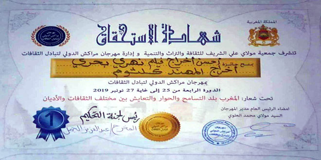 يشار إلى أن هذه هي الجائزة الثالثة للفيلم بعد أن نال أفضل إخراج في مهرجان النور السينمائي الدولي بالمغرب وجائزة الجمهور في المهرجان الوطني للسينما والبيئة بالمغرب.