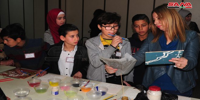 في ورشة عمل للفن العجمي تجمع عدد من طلاب المدارس في مكتبة الأسد ليتعلموا تفاصيل هذا الفن الدمشقي العريق حاملين بأيديهم الريشة والألوان ليملؤا اللوحات والزخارف بالمعاجين وتبدو على وجهوهم علامات الفرح.