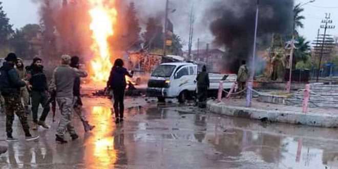 ونقل مراسل سانا عن مصادر محلية في المدينة أن سيارتين مفخختين انفجرتا بعد ظهر اليوم عند دوار الأعلاف “قطنة” في مدينة رأس العين ما تسبب باستشهاد مدنيين اثنين وإصابة 6 آخرين بجروح بعضها خطيرة.