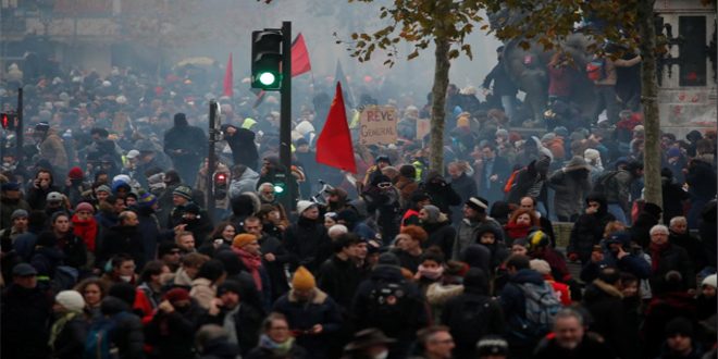 وذكرت رويترز أن معظم أنحاء فرنسا أصيبت بحالة من الشلل منذ يوم أمس وذلك مع بدء إضراب عمال النقل الذين انضم لهم معلمون وأطباء وأفراد من الشرطة ورجال إطفاء وموظفون حيث حاولت الشرطة الفرنسية قمعهم مستخدمة الغاز المسيل للدموع في شوارع العاصمة باريس واعتقلت العشرات منهم.