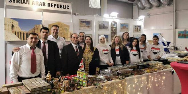 وشمل الجناح السوري معروضات متنوعة من الأقمشة والألبسة الفلكلورية والمطرزات وقطع الموزاييك والمنمنمات ولوحات الخط العربي إضافة إلى المأكولات والحلويات التي تعكس غنى وتنوع المطبخ السوري.