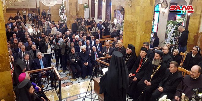 وأشار إلى أن أدوات الإرهاب استطاعت هدم المساجد والكنائس لكن لن تستطيع هدم سورية ونحن نقوم ببناء دور العبادة لتكون في خدمة الإنسان ونعطي الحب والسلام والحياة للجميع داعياً أبناء الوطن في الخارج للعودة إليه والإسهام في إعادة بنائه.