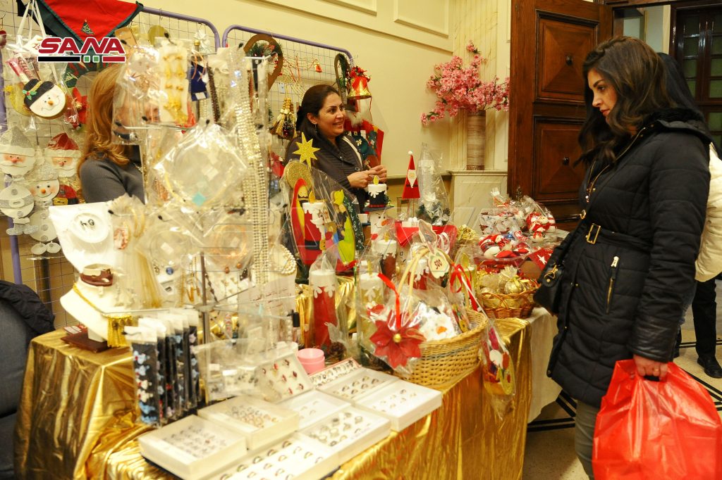 ستون سيدة قدمن منتجات من صنع أيديهن في البازار الخيري الذي تقيمه أخوية سيدات الصليب الخيرية ويضم كل ما تحتاجه الأسرة من مستلزمات العيد في مكان واحد وفق تصريح منظمة البازار رئيسة الأخوية “نازك كركر نمر” لمندوبة سانا.