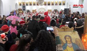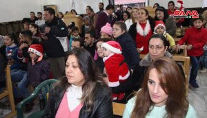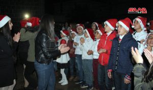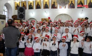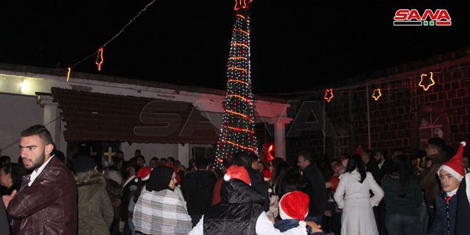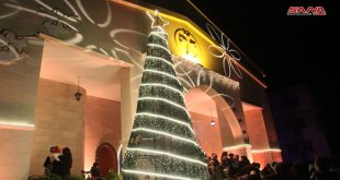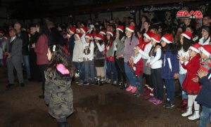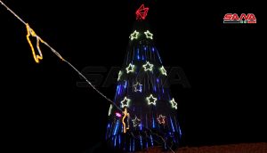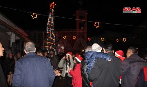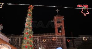 الأب بطرس بيطار راعي الكنيسة قال إننا نضيء شجرة الميلاد والمغارة احتفالاً بميلاد المسيح ونأمل بأن يكون رسالة لكل العالم لمزيد من المحبة والتآلف بين الناس وأن يعود على سورية بمزيد من الطمأنينة والخير والسلام.