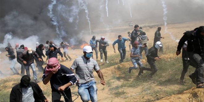 أصيب عشرات الفلسطينيين اليوم بحالات اختناق جراء اعتداء قوات الاحتلال الإسرائيلي عليهم في مخيم العروب شمال الخليل بالضفة الغربية.