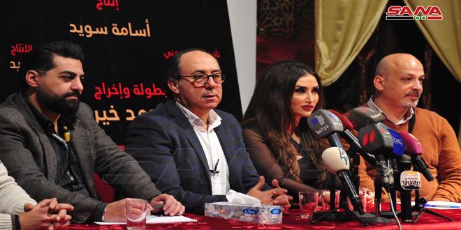 أسرة العمل عقدت مؤتمرا صحفيا على خشبة مسرح الخيام اليوم حيث ستنطلق أولى عروض العمل في الـ 26 من الشهر الحالي ولغاية أول أيام رمضان حيث اعتبر الجراح أن تقديم المسرحية مغامرة وتحد كبير في ظل انحسار المسرح اليوم واتجاه معظم النجوم إلى الدراما التي تحقق الانتشار الأوسع وترضي الجانبين المادي والمعنوي للفنانين.