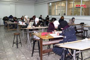 وفي كلية الفنون الجميلة والتطبيقية بين الدكتور أديب أعرج عميد الكلية أن الكلية تضم عشرة أقسام تم تفعيل ستة منها الديكور والعمارة الداخلية والاتصالات البصرية والإعلان وتصميم النسيج والأزياء والرسم والتصوير والغرافيك والنحت ويتخرج منها سنوياً نحو 110 طلاب وهي كلية نموذجية تطبيقية يتم خلالها إيلاء الطالب الاهتمام الكبير لافتاً إلى استمرار الطلبة بالدوام أثناء فترة الحرب رغم الظروف الصعبة.