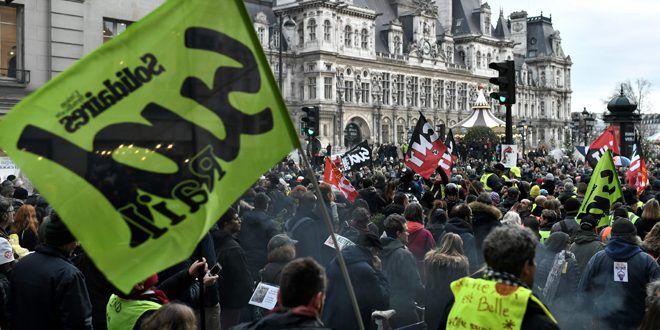 وذكرت وكالة الصحافة الفرنسية أن العاصمة باريس شهدت مظاهرة احتجاجية في ساحة البورصة رفع خلالها المتظاهرون لافتات كتب عليها “إضراب وتعطيل.. ماكرون استقل” رداً على سعي الحكومة لرفع سن التقاعد إلى 64 عاماً في الوقت الذي دعت فيه عدة نقابات إلى مظاهرات محلية ينضم إليها محتجو حركة “السترات الصفراء”.