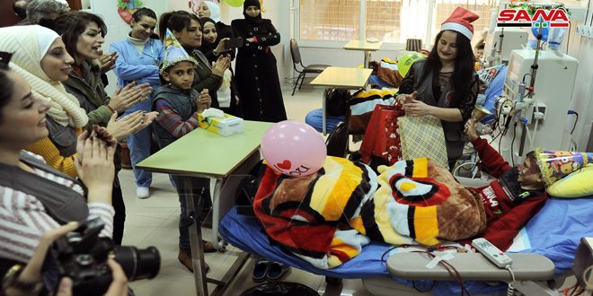 لحظات فرح وسعادة عاشها أكثر من 15 طفلا وطفلة ممن يتلقون خدمة غسيل الكلية ضمن قسم الأطفال بالهيئة العامة لمشفى الكلية الجراحي بمجمع ابن النفيس الطبي بدمشق خلال فعالية ترفيهية نظمتها جمعية رعاية الأطفال المصابين بالشلل الدماغي بالتعاون مع الهيئة اليوم بمناسبة أعياد الميلاد المجيد ورأس السنة الميلادية.