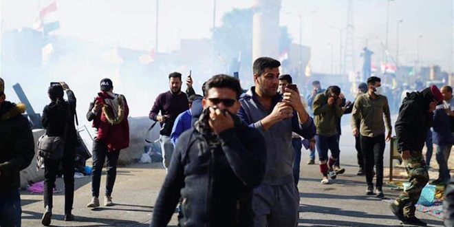 أصيب عدد من العراقيين بحالات اختناق جراء إطلاق قوات اميركية قنابل الغاز اليوم خلال تجدد الاعتصامات لليوم الثاني أمام السفارة الأميركية في بغداد تنديدا بالعدوان على مقار الحشد الشعبي والذي أوقع العشرات من الشهداء والجرحى.