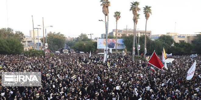 وخرجت الحشود في مدينة الأهواز وهي تردد الهتافات المنددة بالولايات المتحدة وجريمتها والمعبرة عن الحزن باستشهاد سليماني والمهندس ورفاقهما.