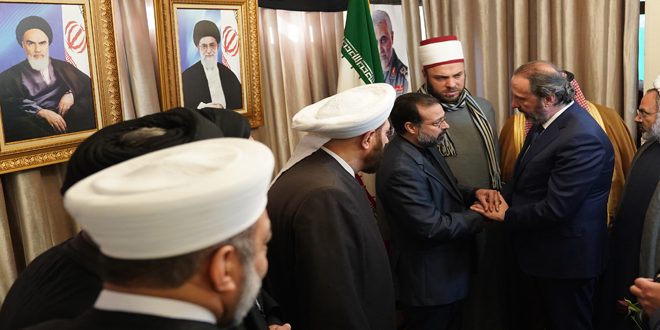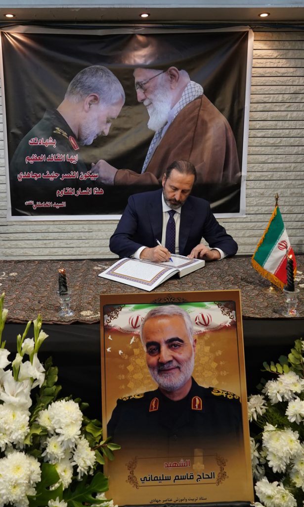بتكليف من السيد الرئيس بشار الأسد قدم اليوم وزير شؤون رئاسة الجمهورية منصور عزام التعازي باستشهاد الفريق قاسم سليماني قائد فيلق القدس وكوكبة من رفاقه المقاومين من إيران والعراق الشقيق وذلك في مقر السفارة الإيرانية بدمشق.