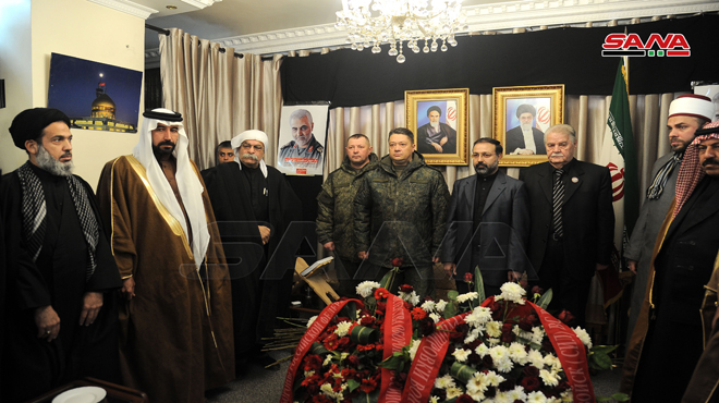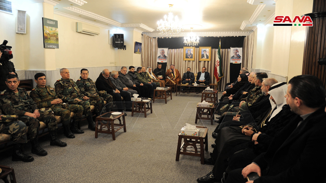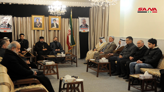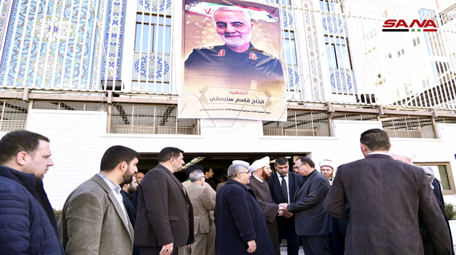 أقامت سفارة الجمهورية الإسلامية الإيرانية في دمشق مجلس عزاء باستشهاد الفريق قاسم سليماني قائد فيلق القدس وكوكبة من رفاقه المقاومين الذين ارتقوا جراء العدوان الأمريكي الغادر بالقرب من مطار بغداد الدولي.